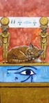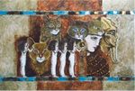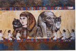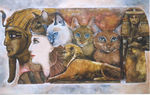 2001De godin Bastet met haar katten. De gouden farao en het beeld van de tempeldanseres refereerd aan haar goddelijke status in het antieke Egypte De ogen van zowel de godin als de katten weerspiegelen zowel het heden als verleden