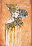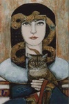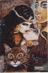 2001Egyptische godin met twee katten. De geheimzinnige blik in de ogen van de katten zowel als de vrouw corresponderen met de mysterieuze uitstraling van het beeld in het voetstuk, de sfinx Ook als poster te koop, kijk bij links voor adressen